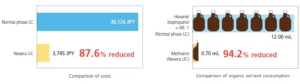 Comparaison des coûts et de la consommation de solvant organique pour une seule analyse par LC conventionnelle en phase normale vs. Le SFC est indiqué ci-dessous. L’utilisation de la SFC permet de réduire le coût total de l’analyse de 87,6 % et la consommation de solvant organique de 94,2%.